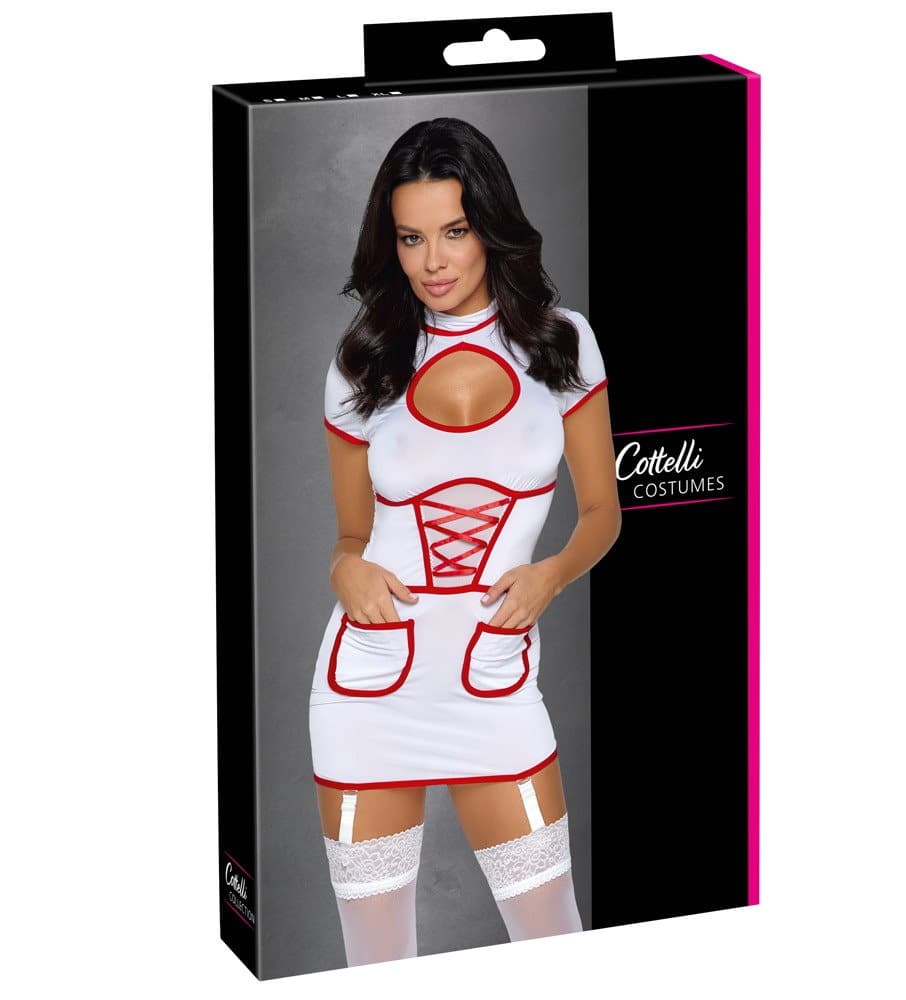 Robe à bretelles courtes semi-transparente au look d’infirmière de Cottelli COSTUMES en blanc avec des détails rouges contrastants. Élastique sur tout le pourtour dans une coupe près du corps avec des demi-manches et une grande découpe à l’encolure. Deux poches plaquées et empiècement Powernet sous laçage décoratif à l’avant. Col montant avec 2 boutons à l’arrière du cou. Les bretelles réglables sont également entièrement amovibles.