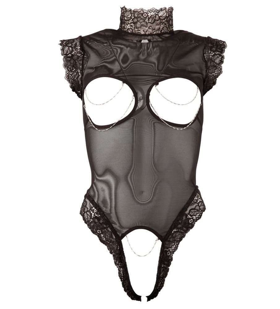 Deze body staat open voor bijna alles… Licht transparante body met kant aan de hals, rond de benen en de korte mouwen. Deze supermooie open body heeft een hals sluiting achteraan met 2 kleine knopen. Open borsten en kruis versierd met afneembare ketting.