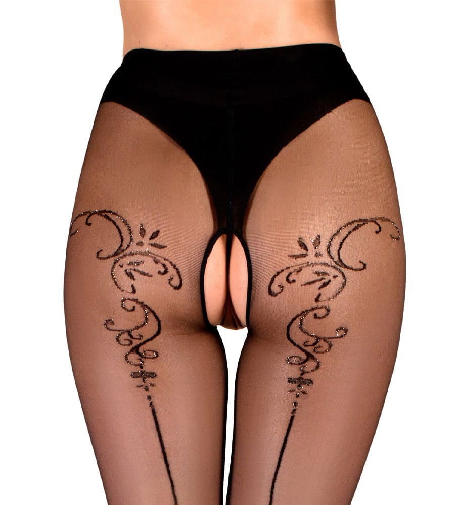 Elegante zwarte panty met open kruis en sierlijke fantasiepatronen die de benen accentueren met een luxe, sensuele uitstraling.